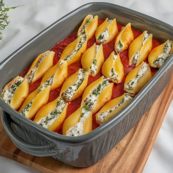 Gigantic pasta shells stuffed with a blend of spinach, ricotta cheese, Parmesan cheese, and herbs, prepared in marinara sauce until bubbly and brilliant.