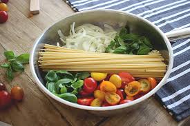 Cook pasta in a pot with cherry tomatoes and olives.Once al dente, stir in chopped basil and crumbled feta.