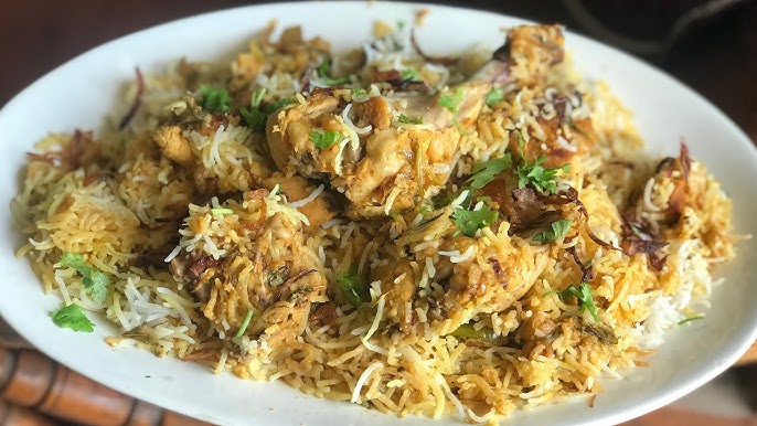 A royal dish originating from the Nizams of Hyderabad, this biryani is a flavourful blend of basmati rice, marinated meat (often chicken or mutton) and a variety of spices. Prepared using the "dum" (slow cooking) method, it is usually served with raita (yogurt sauce) and mirchi ka salan (spicy curry) to make a complete meal.